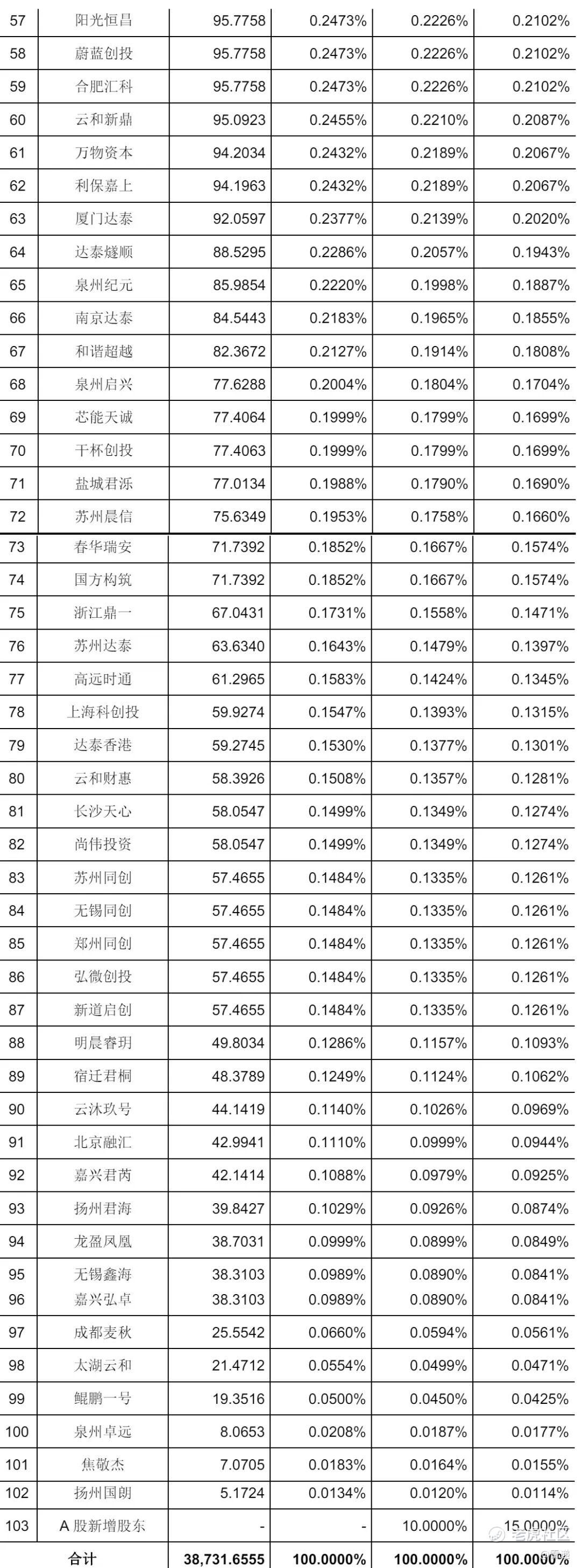 万物资本、利保嘉上分别持股为0.2067%,厦门达泰持股为0.2020%,达泰燧顺持股为0.1943%,泉州纪元持股为0.1887%,南京达泰持股为0.1855%,和谐超越持股为0.1808%,泉州启兴持股为0.1704%,芯能天诚、干杯创投分别持股为0.1699%,盐城君泺持股为0.1690%,苏州晨信持股为0.1660%,春华瑞安、国方构筑分别持股为0.1574%。