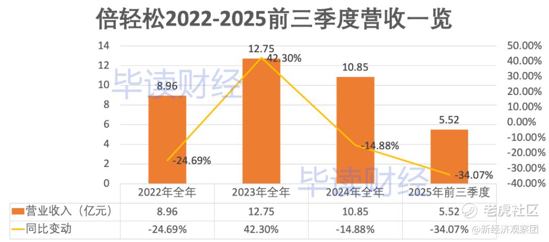 真正的警讯出现在2025年。根据公司披露的前三季度财报,倍轻松报告期内营业收入仅为5.52亿元,同比暴跌34.07%;归母净亏损6562.80万元,同比暴跌600.98%,创下近三年同期最大亏损幅度。营收与利润双双加速下滑,显示出市场需求疲软、竞争加剧与内部经营效率低下的多重压力正在集中爆发。