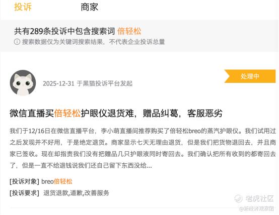 另一方面,从用户使用体验来看,倍轻松的产品质量也受到质疑。目前黑猫投诉上倍轻松相关投诉近300个,主要涉及产品质量问题、退货难、售后差等等。这些投诉也会继续侵蚀倍轻松的品牌形象,销量也更难以保证。