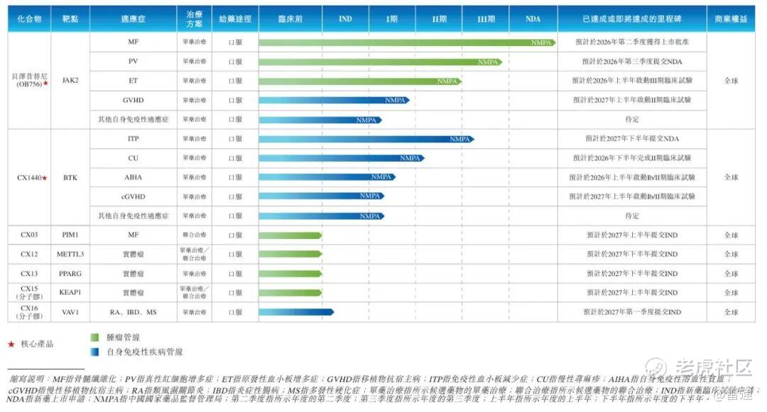 依托邦顺制药高选择性小分子药物发现平台及分子胶发现平台,邦顺制药已建立涵盖一款新药上市申请(NDA)阶段候选药物(贝泽昔替尼)、一款注册性临床阶段候选药物(CX1440)及五款临床前阶段候选药物(CX03、CX12、CX13、CX15及CX16)的管线。