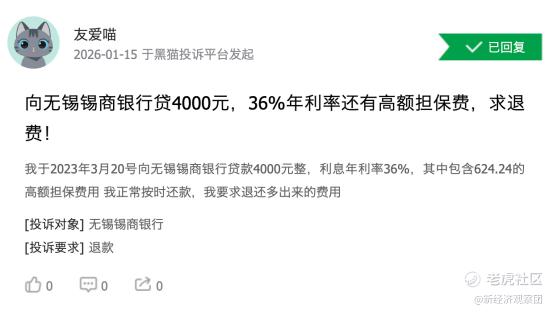 目前锡商银行仅在黑猫投诉的投诉量就达到3700多个。有黑猫投诉用户反映,通过锡锡贷借款4000元,年化利率高达36%,其中包含624.24元的高额担保费。