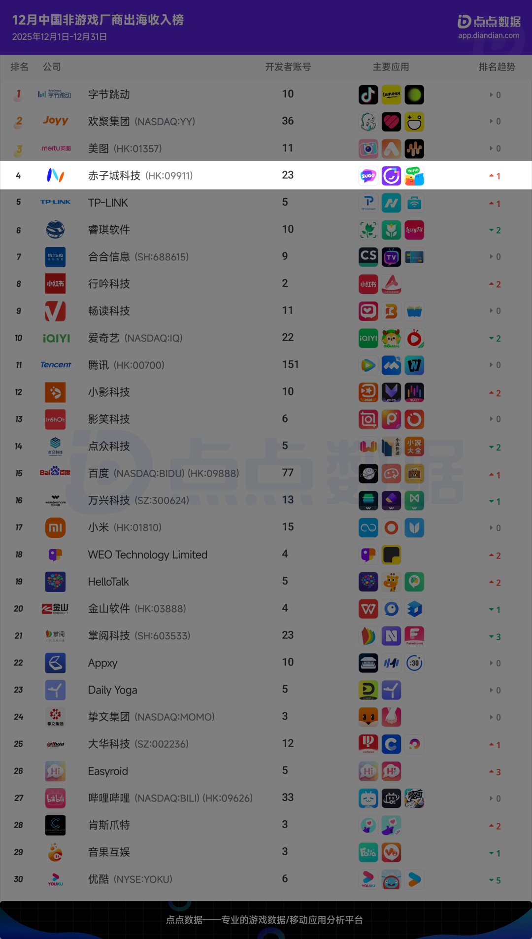 社交业务高速增长的同时,公司整体市场竞争力亦持续加强。2025 年 12 月,公司在点点数据发布的“中国非游戏厂商出海收入榜”中位列第 4 名,较前期攀升 1 位,彰显出强劲的发展势头。