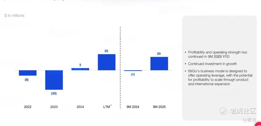 BitGo在2022年、2023年、2024年Adjusted EBITDA分别为-816.5万美元、-2973万美元、323万美元,2025年前9个月Adjusted EBITDA为2034万美元。