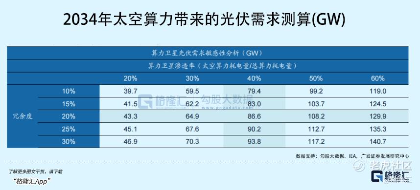 如果以渗透率(太空算力耗电量/总算力耗电量)和冗余度(卫星其他部件的能源损耗)为变量进行敏感性分析,在渗透率40%、冗余度20%的中性预期下,预估到2034年算力卫星带来的光伏需求将达到86.6GW。后续若渗透率持续提高,需求有望超100GW。