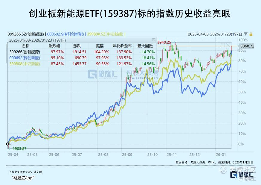 市场资金的流向往往是最敏锐的风向标,布局了光伏产业链的创业板新能源ETF(159387)连续5日资金净流入超1.38亿元。自2025年4月8日—2026年1月23日,创新能源上涨97.97%,领先同期科创新能(95.10%)、中证新能(87.45%)等同类指数。