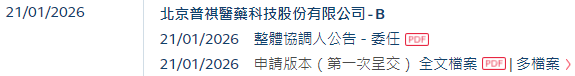 2026年1月21日,总部位于北京丰台区的北京普祺医药科技股份有限公司 PrimeGenX Therapeutics Co., Ltd.(以下简称"普祺医疗")向港交所递交招股书,拟在香港主板挂牌上市。