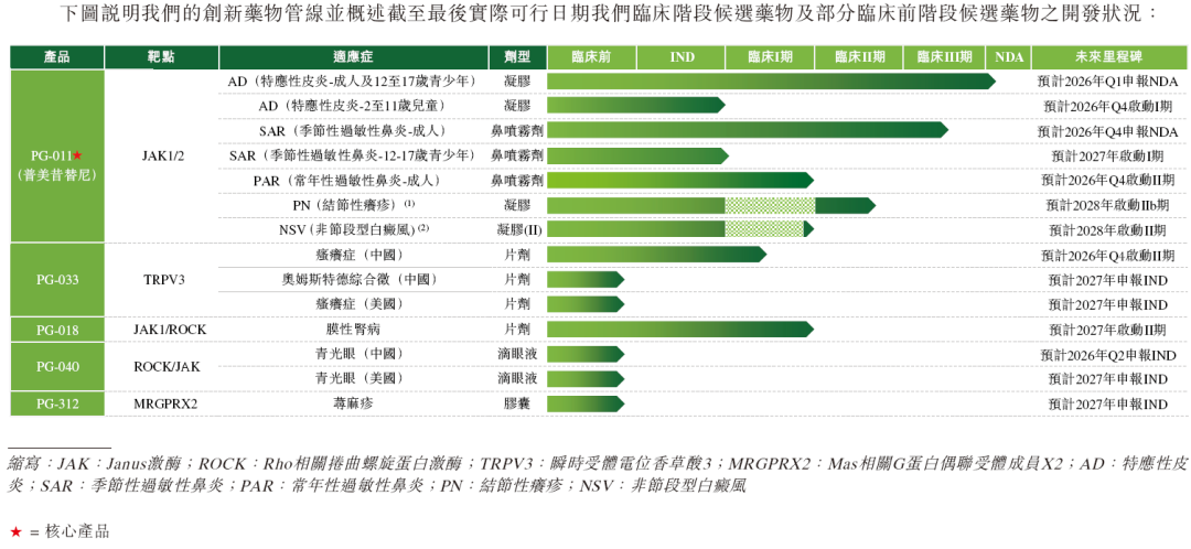 PG-033片剂:具备同类首创潜力的瞬时受体电位香草酸亚型3(TRPV3)抑制剂,抑制钙离子释放通道并阻断瘙痒信号通路,目前处于I期临床研究阶段。除用于治疗与神经性皮炎相关的瘙痒外,公司也将PG-033的适应症扩展至缓解奥姆斯特德综合征相关的顽固性瘙痒与角化过度症,该疾病目前尚未有获批治疗方案,带来了迫切未被满足的医疗需求。