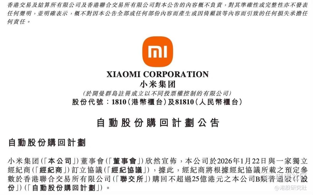 1月22日,小米宣布启动25亿港元自动股份回购计划,这彰显了其在资本市场的决策深度。从更全面的角度看,这更像是小米对资本市场进行了一次结合行业周期、资金结构、公司长期战略的综合判断。