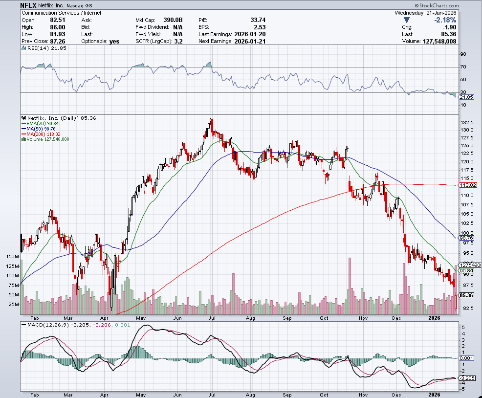 周三,Netflix(NFLX)再次上演了"梅开二度"的戏码——继2025年10月第三季度财报后第二次出现业绩后跳空下跌。尽管公司基本面看似稳健,甚至交出了史上首个营收破120亿美元的季度答卷,但股价却遭遇下挫。目前,股价较去年高点已回撤36.35%,并创下52周新低。
