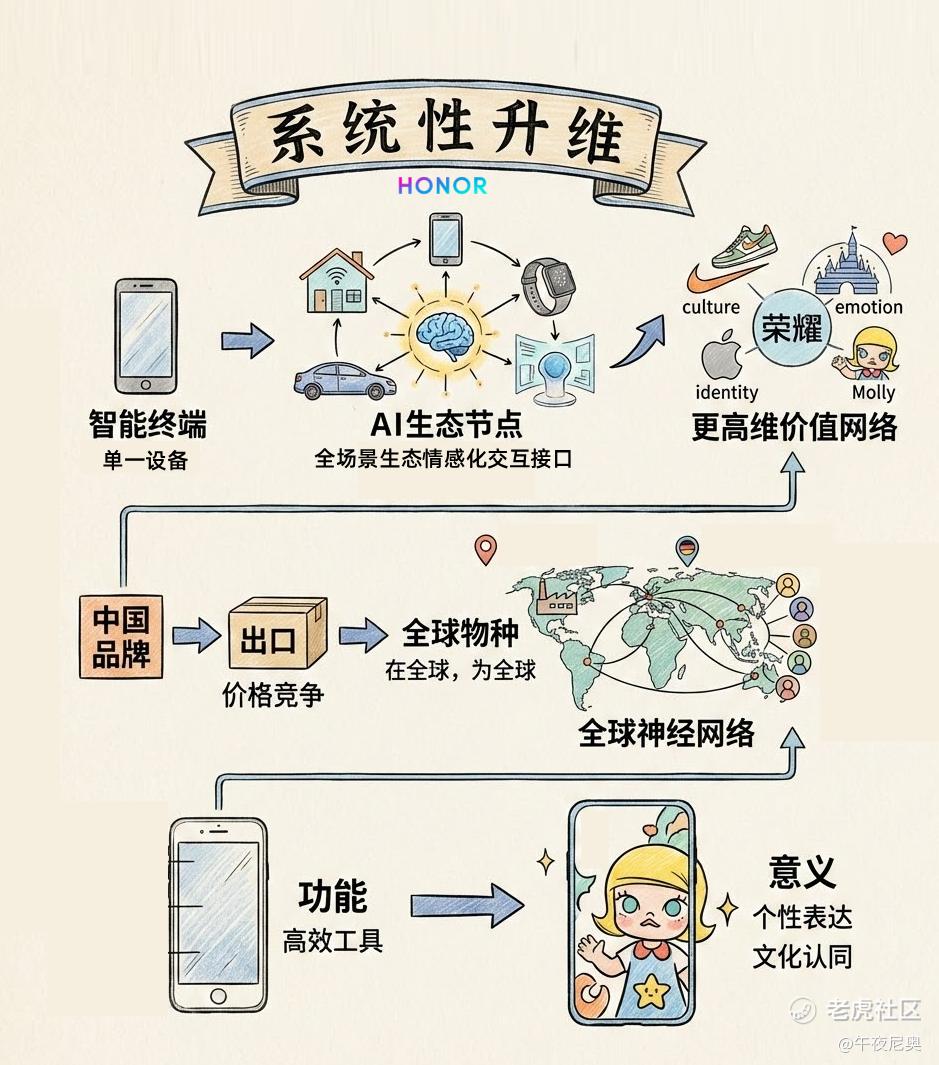 荣耀正在尝试类似的跃迁,透过泡泡玛特联名 IP 产品里,荣耀正在把技术、设计与文化放在同一叙事中,让品牌不再只出现在参数表里,而是用更柔软的方式,让技术被感知,让情感、AI、系统与生态被逐步纳入统一视角之中。