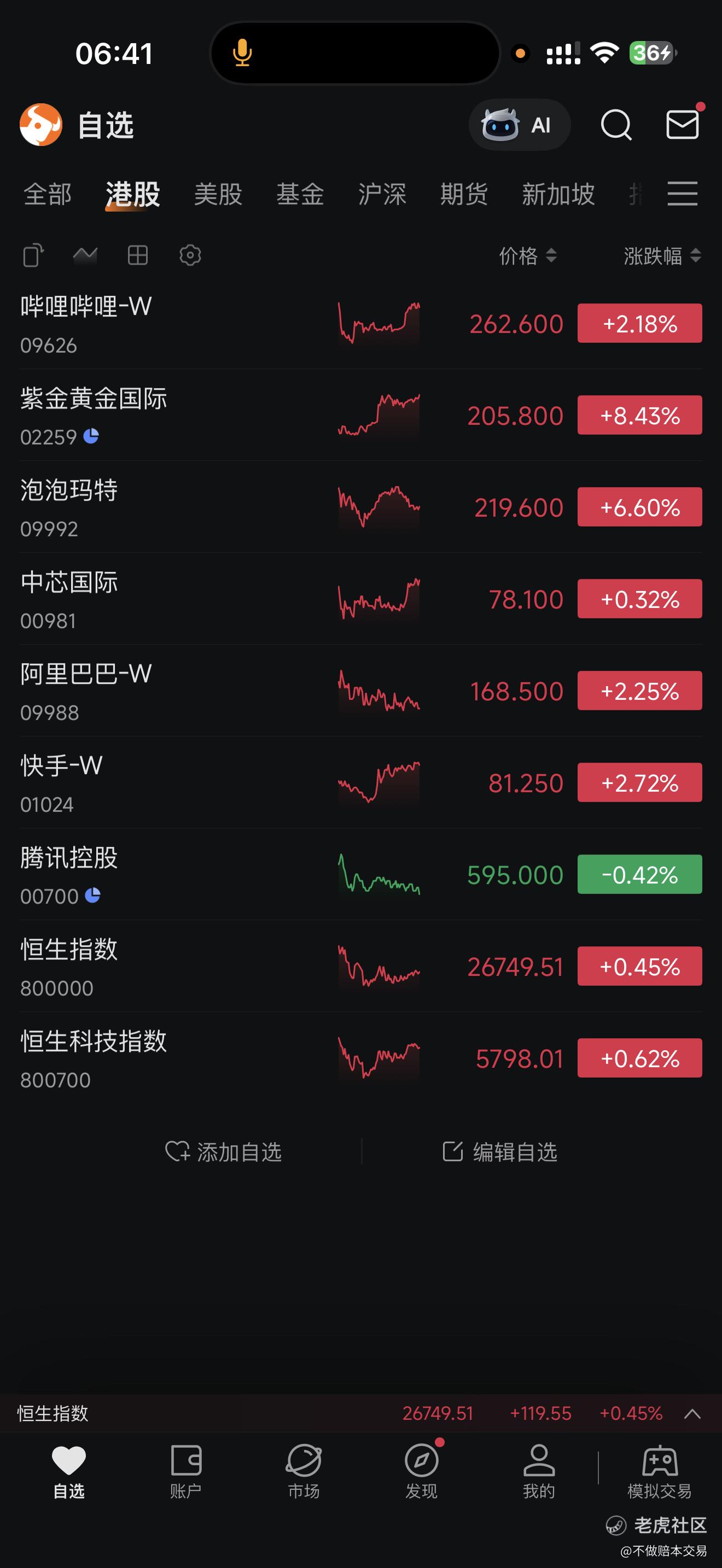 $腾讯控股(00700)$ 这么告诉你们吧,我前两周闭着眼买,自选股,里面的这一些股全部都是大涨的,但是我偏偏选了腾讯,不止没有涨,还让我亏了 3 万港币,我这都是高抛低吸做 T,才亏了 3 万,我要不做 T,那亏损简直无法想象,至少亏 10 万,真的是命啊,中概股就这样,你以为它是科技股他偏不,你看对了板块,看对了大盘,看对了行情,个股它不涨啊,一点办法都没有,天天说自己是科技股,资金是最诚实的,就是个老登股,甚至于连老登骨都不如
