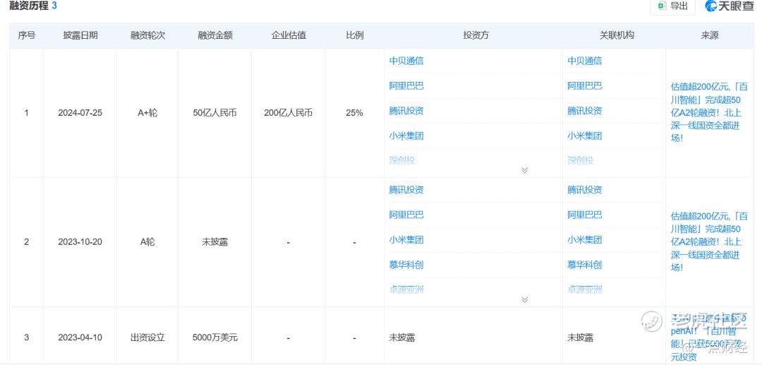 根据天眼查的信息,百川上一轮融资停在2024年7月,拿了50亿,估值200亿。之后就没再有公开的融资消息。