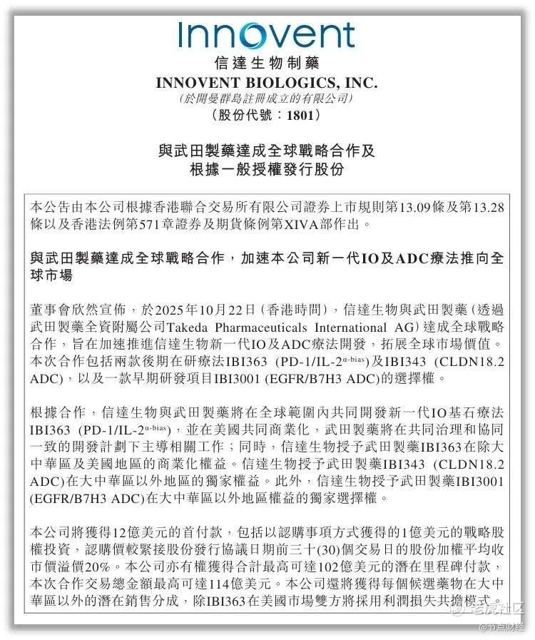 2025年10月,信达生物宣布与日本知名药企——武田制药达成全球战略合作,交易总金额最高至114亿美元,包括1亿美元的溢价战略股权投资。
