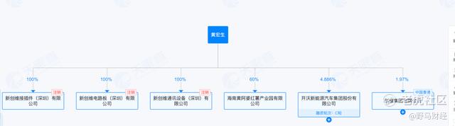 天眼查信息显示,黄宏生本人名下关联的存续企业共14家,其中担任法定代表人的公司有8家,业务涉及物业管理、汽车制造、电子电器等多个行业。在对外投资方面,他主要持有3家公司股份:开沃新能源汽车集团(持股4.866%)、创维集团(持股1.97%),以及前述的海南黄阿婆红薯产业园有限公司(持股60%)。