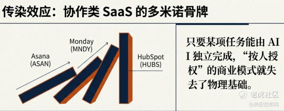 这一趋势正快速蔓延至Asana(ASAN)、Monday.com(MNDY)和HubSpot(HUBS)等协作与营销平台。只要某项任务能由AI独立完成,“按人授权”的商业模式就失去了物理基础——你不需要给AI买许可证。