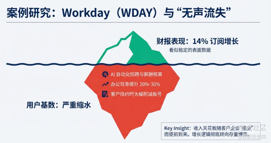 结果是:客户没有取消合同,却在续约时大幅削减账号数量。这种“无声流失”让WDAY的收入天花板随企业“瘦身”而提前到来。即便2025年仍录得约14%的订阅增长,其增长逻辑已从“扩张驱动”转向“存量博弈”。