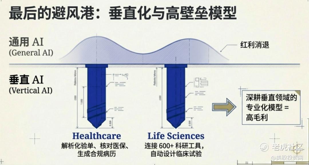 更关键的是,AI 正在攻入高壁垒领域,例如 Claude for Healthcare,它能够解析化验单、核对医保、生成合规病历。在生命科学领域,AI 可以连接 600 多种科研工具,自动设计临床试验。通用 AI 红利逐渐消退,垂直化、专业化的高壁垒模型,成为少数仍能维持高毛利的避风港。