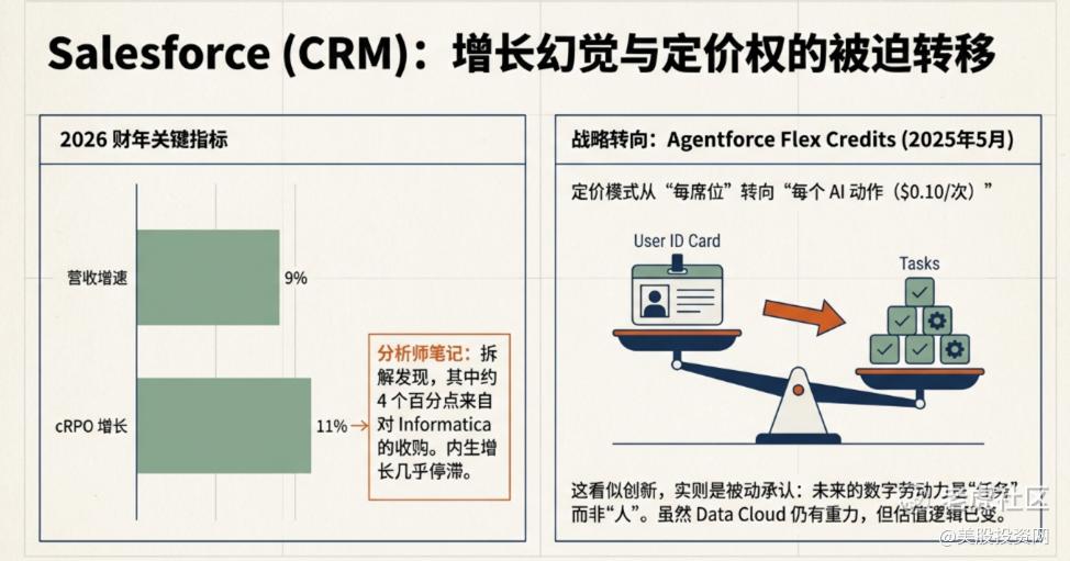 $赛富时(CRM)$ 曾是SaaS行业的标杆,靠“按人头收费”的席位模式长期领跑市场。但到了2026财年,其营收增速已放缓至9%左右,衡量未来增长动能的关键指标——cRPO(当前剩余履约义务)仅增长11%。