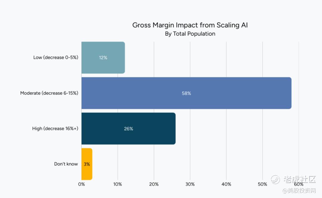 再来看这张图,58% 的公司认为,AI 推理成本让其毛利率下降了 6% 到 15%;而 26% 的公司认为毛利下降幅度超过了 16%。