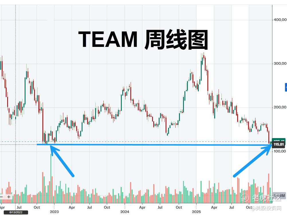 以TEAM为例,其股价从高点以来已累计下跌约65%,目前跌到2022年底部支撑位110美元,这是一个很强的支撑。