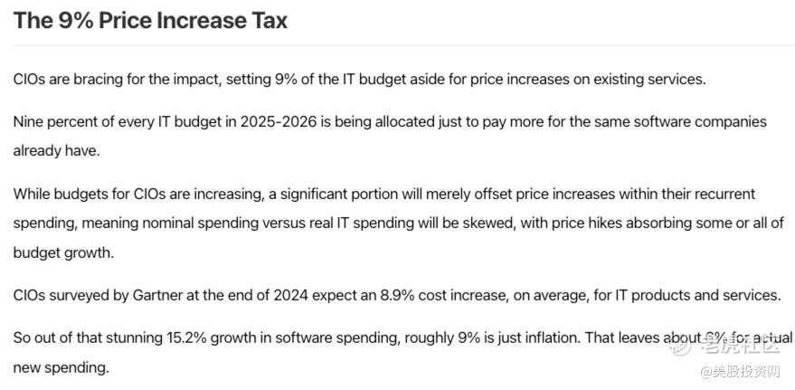 来看这张图,软件支出预测增长 15.2%。但细细拆解后发现:9% 的增长只是用于支付现有软件的涨价(很多供应商以 AI 功能为理由提高续费价格,被业内称为 AI 税),约 4–5% 的增长是现有软件加入 AI 功能后导致的升级支出,而真正代表 新客户或全新产品采购的增长只有约 1–2%。