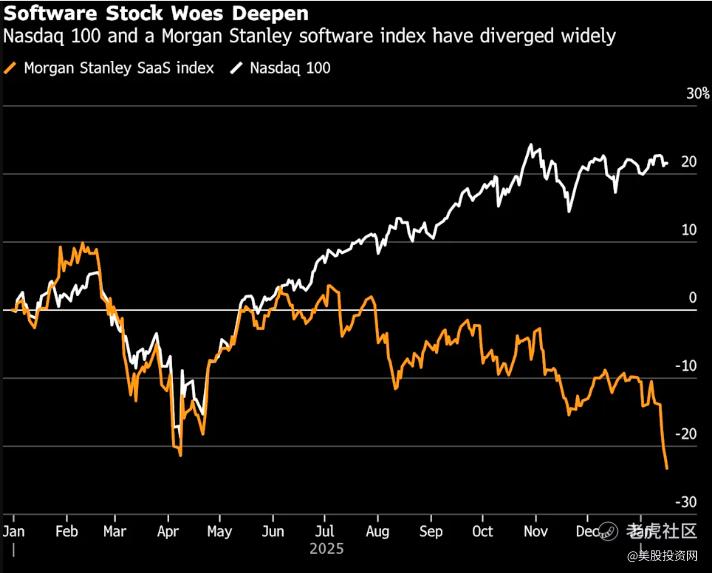 2026年,不少曾经风光无限的美股软件明星公司,股价已从高点“腰斩”,甚至跌去70%以上。摩根大通追踪的一篮子SaaS股.票,今年至今已经暴跌25%。
