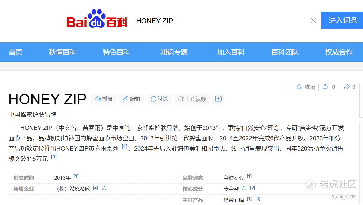 百度百科资料则显示,HONEY ZIP(中文名:黄春雨)是中国的一家蜂蜜护肤品牌,始创于2013年,秉持“自然安心”理念,专研“黄金蜜”配方开发面膜产品。品牌初期填补国内蜂蜜面膜市场空白,2013年引进第一代蜂蜜面膜,2014至2022年完成6代产品升级。2023年细分产品功效定位推出HONEY ZIP黄春雨系列。2024年先后入驻泊伊美汇和屈臣氏,线下销量表现突出,同年520活动单次销售额突破115万元。