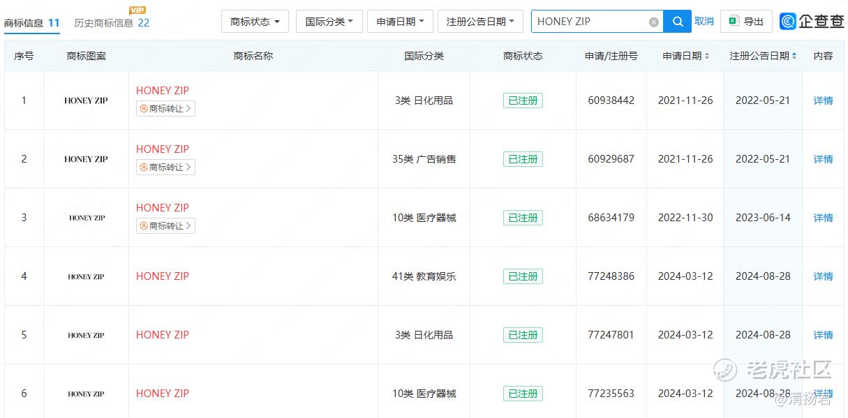 早在2022年5月,杭州伸美就开始注册HONEY ZIP 相关的多个类别商标,包括但不限于第3类日化用品、第35类广告销售等10多个商标。