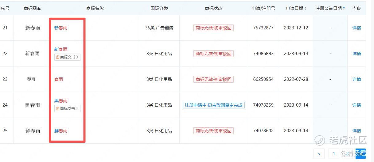 不仅如此,清扬君舆情分析中心查询发现,杭州伸美先后申请春雨、黑春雨、新春雨等共计25个相关商标,而且几乎都是3类日化用品、第35类广告销售的商标。