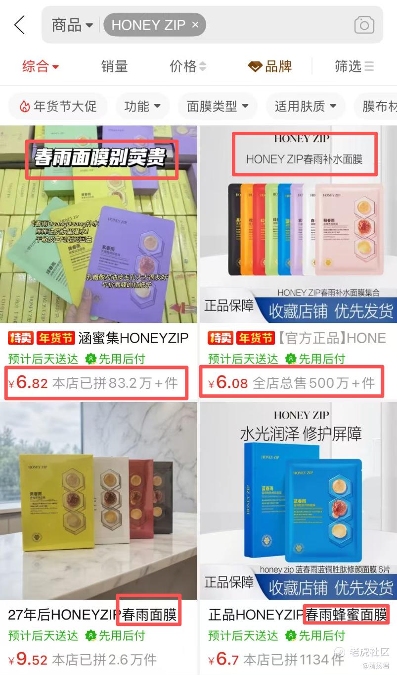 有意思的是后续。被狠狠打假、陷入争议的HONEY ZIP,市场表现急转直下。不过现在某些平台的商家在销售该产品时仍在大肆宣传“春雨”面膜,而且销量500万+的都有。这不由让人质疑杭州伸美的管理能力和营销策略。