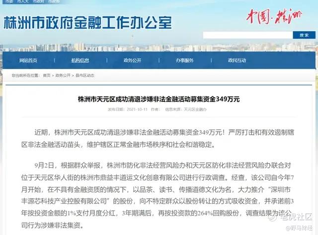 值得一提的是,2021年10月,株洲市天元区金融办发布了一条消息,根据群众举报,一家名为“株洲市鼎益丰道运文化创意有限公司”遭到相关部门调查,成功清退涉嫌非法金融活动募集资金349万元。