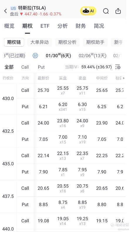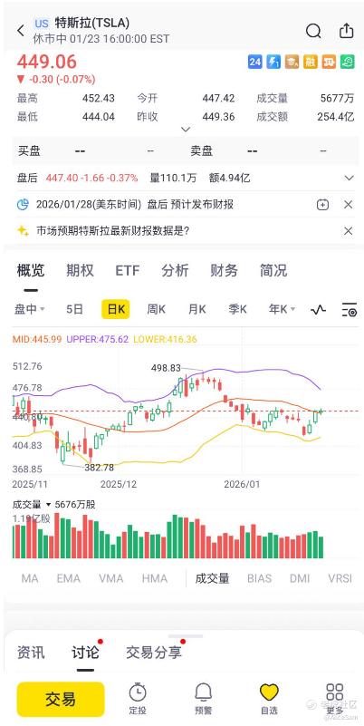 当大家站在财报前夕,就会发现,市场关心的已经不只是 “Q4 赚了多少钱”,而是特斯拉能否在2026年把 “AI叙事” 从愿景推进到可计量的现金流路径。而这恰好与马斯克在达沃斯释放的信息高度同频。当“AI叙事”成为唯一估值锚,特斯拉能否借FSD、Robotaxi、Optimus三把火站稳430美元,这是一个很多人都在赌的点。财报前几天的IV是很高的,很多朋友都在用期权下注呢。[财迷]