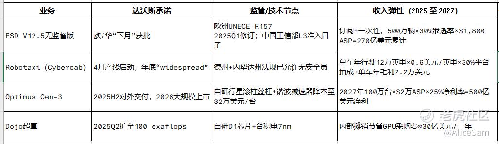 还有那个不容忽视的催化剂,达沃斯“三张时间表”能否落地。达沃斯那一幕的市场意义在于马斯克把过去一年“模糊的愿景”,用一组更具可检验性的时间线重新包装了一遍。如果把这些关键变量排个序,大概就是 :监管批准(欧/华)> 无安全员里程数据 > Optimus BOM降本 > Dojo自研芯片良率。