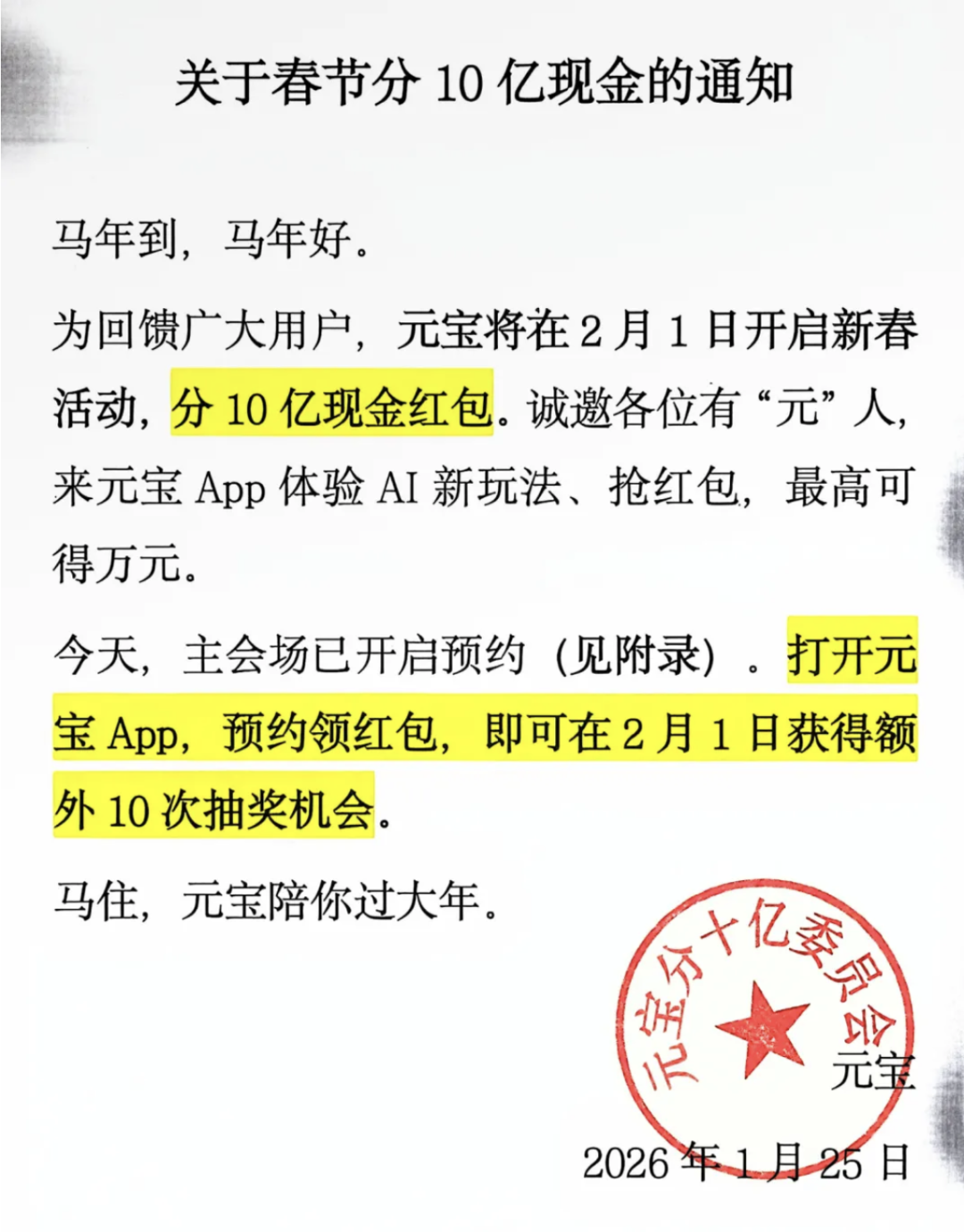 显然,腾讯这波操作是希望增强元宝独立APP的下载量和活跃度,因为,最终公众号的“原文阅读”是直接跳转到元宝的下载页面的;同时用户需要在元宝APP中预约,才能领红包,并在2月1日获得额外的10次抽奖机会。用户有机会瓜分10亿现金红包,也有机会抽得限量100张的1万元小马卡。