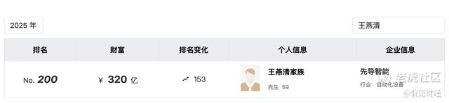 受此影响,先导智能实际控制人王燕清身价也是水涨船高,根据股权穿透,王燕清共持有公司29.31%的股权,根据最新收盘价格计算,该部分持股市值约为290亿元。根据胡润2025年百富榜数据,王燕清以320亿财富位列榜单第200位,排名较上年上升153位。