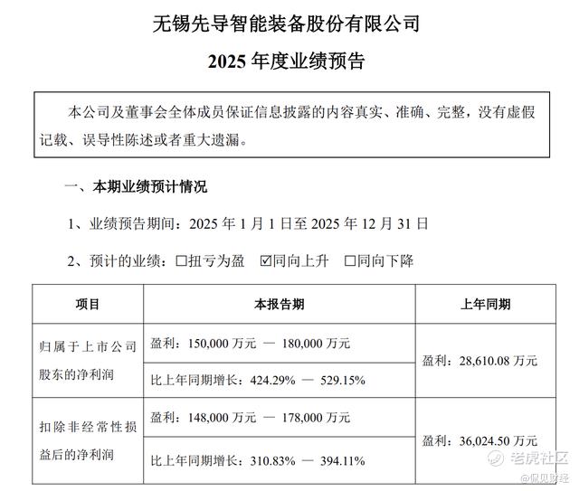 1月25日晚,锂电池智能装备及光伏智能装备制造商先导智能 $先导智能(300450)$ 发布2025年度业绩预告,预告显示,预计公司2025年实现净利润15亿元至18亿元之间,同比增长424.29%至529.15%,去年同期盈利2.86亿元;预计实现扣非净利润14.8亿元至17.8亿元之间,同比增长310.83% 至394.11%,去年同期扣非净利润为3.60亿元。