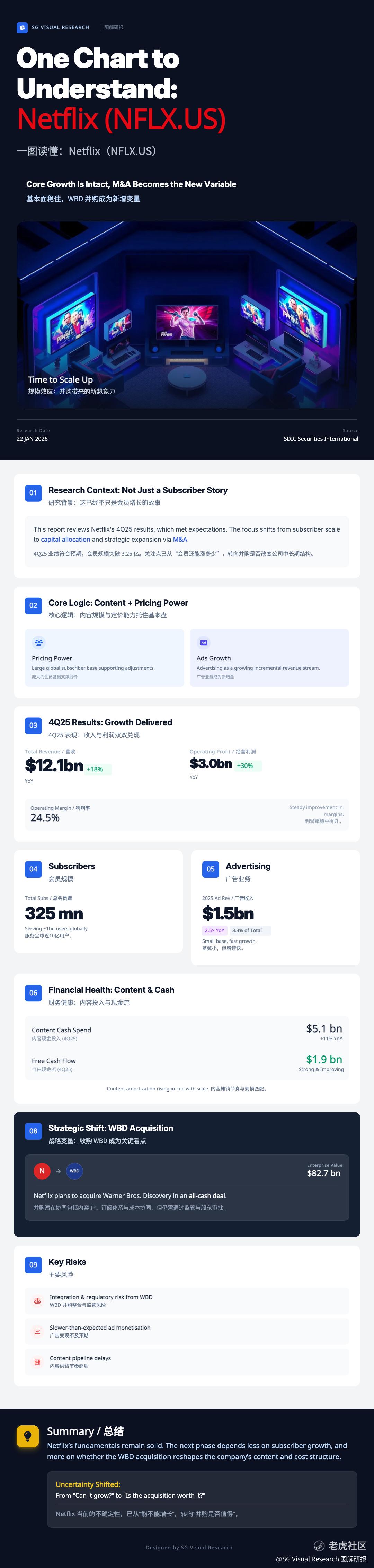 {"i18n":{"language":"zh_CN"},"detailType":1,"isChannel":false,"data":{"magic":2,"id":525789757375880,"tweetId":"525789757375880","gmtCreate":1769393313491,"gmtModify":1769394350579,"author":{"id":3558404604264882,"idStr":"3558404604264882","authorId":3558404604264882,"authorIdStr":"3558404604264882","name":"SG Visual Research 图解研报","avatar":"https://static.tigerbbs.com/a6e90d8e86d025ca79fd03dfd73d1fa0","vip":1,"userType":1,"introduction":"","boolIsFan":false,"boolIsHead":false,"crmLevel":3,"crmLevelSwitch":0,"currentWearingBadge":{"badgeId":"e50ce593bb40487ebfb542ca54f6a561-4","templateUuid":"e50ce593bb40487ebfb542ca54f6a561","name":"明星虎友","description":"加入老虎社区2000天","bigImgUrl":"https://static.tigerbbs.com/dddf24b906c7011de2617d4fb3f76987","smallImgUrl":"https://static.tigerbbs.com/53d58ad32c97254c6f74db8b97e6ec49","grayImgUrl":"https://static.tigerbbs.com/6304700d92ad91c7a33e2e92ec32ecc1","redirectLinkEnabled":0,"hasAllocated":1,"isWearing":1,"stampPosition":0,"hasStamp":0,"allocationCount":1,"allocatedDate":"2026.01.12","individualDisplayEnabled":0},"individualDisplayBadges":[],"fanSize":13,"starInvestorFlag":false},"themes":[{"themeId":"f71e4dd49828b254721495a5d8bcda5b","categoryId":"2929bb7468f5415f853fd96fb35d7c3b","name":"奈飞拟827亿美元收购华纳兄弟流媒体业务引发美国参议院听证会","type":2,"rnLink":"https://laohu8.com/RN?name=RNTheme&page=/theme/special/finance&rndata={\"themeId\":f71e4dd49828b254721495a5d8bcda5b}&rnconfig={\"headerBarHidden\": true}","description":"奈飞计划以827亿美元收购华纳兄弟探索公司流媒体及影视制作业务,双方高层将于2月出席美国参议院听证会,就交易接受监管审查并争取政府支持。"}],"images":[{"img":"https://static.tigerbbs.com/d55b46fe8e544afb43fa842602fd690b","width":"1080","height":"4525"}],"coverImages":[{"img":"https://static.tigerbbs.com/d55b46fe8e544afb43fa842602fd690b","width":"1080","height":"4525"}],"title":"Netflix 研报解读出炉","html":"<html><head></head><body><a href=\"https://laohu8.com/S/NFLX\">$奈飞(NFLX)$ </a> \n<p>这次业绩本身没太多争议。</p>\n<p>增长、利润、现金流都在原有轨道上。</p>\n<p>真正的新变量,是 WBD 并购。</p>\n<p>不是“能不能涨”,而是 并购值不值、能不能消化。</p>\n<p class=\"t-img-caption\"><img src=\"https://static.tigerbbs.com/d55b46fe8e544afb43fa842602fd690b\" tg-width=\"1080\" tg-height=\"4525\"><span></span></p>\n<p></p>\n<p><br></p></body></html>","htmlText":"<html><head></head><body><a href=\"https://laohu8.com/S/NFLX\">$奈飞(NFLX)$ </a> \n<p>这次业绩本身没太多争议。</p>\n<p>增长、利润、现金流都在原有轨道上。</p>\n<p>真正的新变量,是 WBD 并购。</p>\n<p>不是“能不能涨”,而是 并购值不值、能不能消化。</p>\n<p class=\"t-img-caption\"><img src=\"https://static.tigerbbs.com/d55b46fe8e544afb43fa842602fd690b\" tg-width=\"1080\" tg-height=\"4525\"><span></span></p>\n<p></p>\n<p><br></p></body></html>","text":"$奈飞(NFLX)$ 这次业绩本身没太多争议。 增长、利润、现金流都在原有轨道上。 真正的新变量,是 WBD 并购。 不是“能不能涨”,而是 并购值不值、能不能消化。","highlighted":1,"essential":1,"paper":2,"likeSize":1,"commentSize":0,"repostSize":0,"favoriteSize":0,"link":"https://laohu8.com/post/525789757375880","repostId":0,"isVote":1,"tweetType":1,"viewCount":2556,"commentLimit":10,"likeStatus":false,"favoriteStatus":false,"reportStatus":false,"symbols":["NFLX"],"verified":2,"subType":0,"readableState":1,"langContent":"CN","currentLanguage":"CN","warmUpFlag":false,"orderFlag":false,"shareable":true,"causeOfNotShareable":"","featuresForAnalytics":[],"commentAndTweetFlag":false,"andRepostAutoSelectedFlag":false,"upFlag":false,"length":130,"optionInvolvedFlag":false,"xxTargetLangEnum":"ZH_CN"},"commentList":[],"isCommentEnd":true,"isTiger":false,"isWeiXinMini":false,"url":"/m/post/525789757375880"}