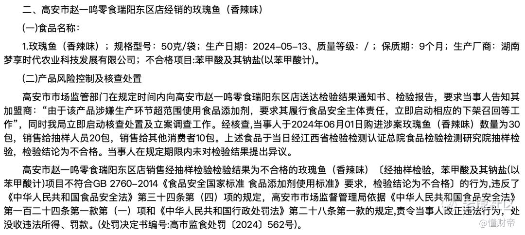 例如:2024年5月,高安市市场监管局通报赵一鸣零食瑞阳东区店销售的“玫瑰鱼(香辣味)”,因超范围使用苯甲酸及其钠盐,不符合食品安全国家标准,被处以没收违法所得、罚款。