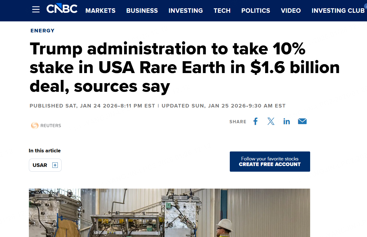 据路透社援引两位知情人士消息称,特朗普政府将以债权+股权合计16亿美元的投资方案,入股美国稀土公司USA Rare Earth,并取得其10%的股权,定价为每股17.17美元。同时,另外还有一笔10亿美元的私人投资(1月23日 $USA Rare Earth Inc.(USAR)$ 收盘价为24.77美元,当前夜盘持续拉升近20%。)。