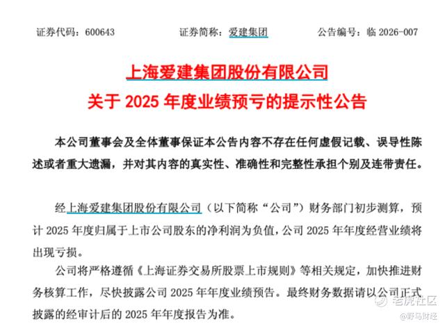 1月16日,爱建集团公告称,2025年全年业绩预计亏损。最终财务数据以公司正式披露的经审计后的2025年年度报告为准。