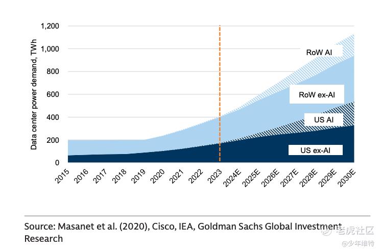 很多报告其实有同样的结论,比如IEA国际能源署,认为全球数据中心用电到2030年在基准情景下将翻倍,达到约945TWh,约占2030年全球用电量接近3%。高盛预测数据中心(AI+非AI)电力需求到2030年相对2023年将增长175%,相当于“新增一个全球前十用电国的规模”。