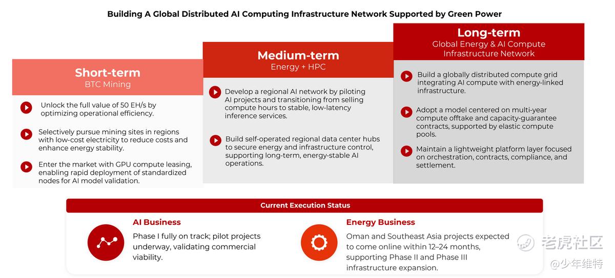 灿谷目前最大的资产,是一张已经铺开的全球算力站点网络。公司公开的战略路径是短期继续通过挖矿和GPU租赁跑通模型,中期建设区域算力枢纽,长期目标是形成一个由能源支撑的分布式AI算力网络。