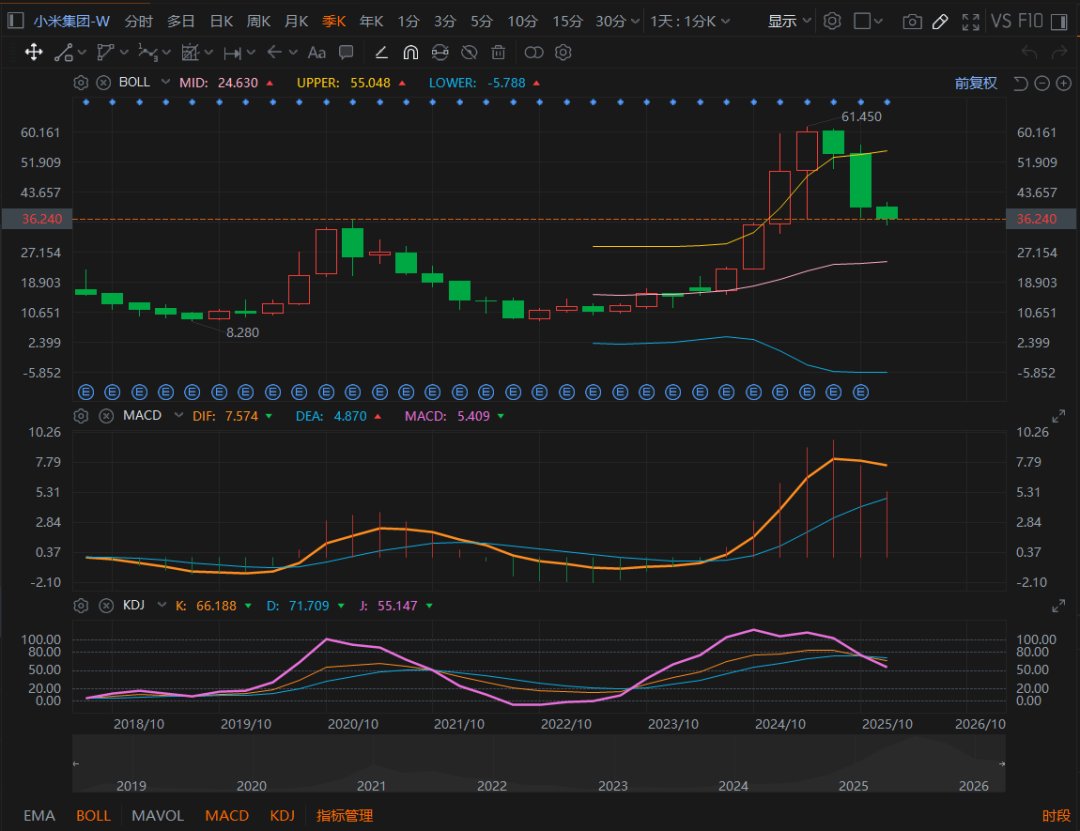 当一家公司连续交出营收利润双双创下历史新高的财报,其股价却应声下跌,在全球科技股狂欢的2025年,小米集团-W (01810.HK) 成为了一个充满矛盾的焦点。2025年前三季度,公司狂揽超3400亿营收,净利润同比暴增近140%,智能手机、智能汽车、AIoT(人工智能物联网)三大引擎轰鸣。然而,与这份“热火朝天”的基本面形成冰冷对比的,是其在资本市场的“严重落伍”——股价持续阴跌,年初至今表现远逊于大市及同行,技术上甚至出现了标志性的“死亡交叉”。这家市值近万亿港元的科技巨头,究竟是被市场误杀的黄金,还是其光鲜财报背后隐藏着市场难以忽视的深层隐忧?本文将为你抽丝剥茧,探寻小米当前估值密码与未来一年的核心博弈点。