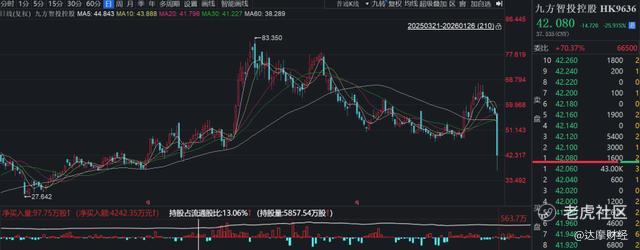 1月26日,“证券投教第一股”九方智投控股(9636.HK,下称“九方智投”)股价突然跳水,盘中一度跌超34%。截至收盘,公司股价跌25.92%至42.08港元,总市值为197亿港元。