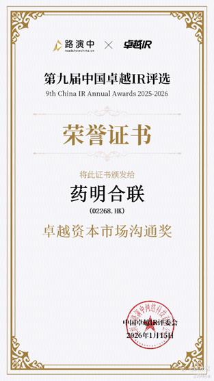 “中国卓越IR年度评选”由Roadshow China路演中与其旗下品牌“卓越IR”联合主办。该评选凭借其覆盖A股、港股及中概股的广泛代表性,以及严谨、透明的评审机制,已成为国内投资者关系领域最具影响力的奖项之一。其中,“卓越资本市场沟通奖” 旨在嘉奖 2025 年度主动创新开展资本市场沟通,且在沟通质量、频次及效果上表现优异的IR团队及上市公司。