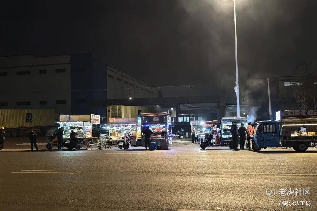 比亚迪厂区门口,人群熙攘,各式小吃餐车有序排开,不少摊主甚至摆出了简易桌椅,方便工人即刻就餐,烟火气十足。