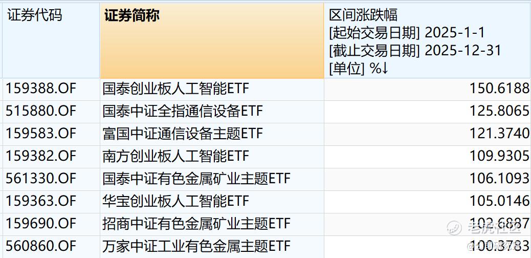 再看行业ETF的爆发力。行业ETF聚焦单一核心赛道,能精准捕捉行业上涨红利,在结构性行情中收益表现更为突出。2025年,国泰创业板人工智能ETF( 159388.OF)以151%的年度涨幅位居全市场ETF榜首,共8只产品实现翻倍。