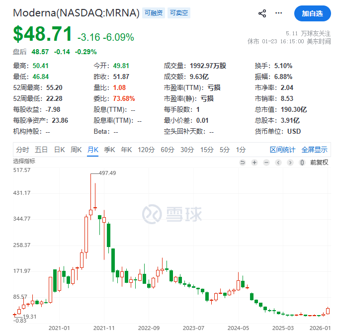 而在过去四年时间内,Moderna市值从1955亿美元的巅峰,跌至去年四季度122亿美元的谷底,跌幅达95%,2026年能否成为“疫苗之王”莫德纳的反转之年?