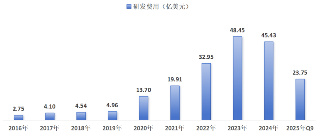 在收入断崖式下滑的同时,公司未能及时调整研发方向,缩减研发管线,2024年和2025年每年约40亿美元,占收入比例远超传统大药企。