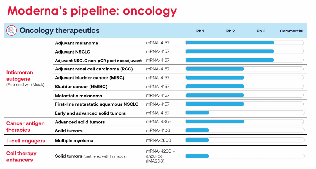 肿瘤领域的早期管线还包括T-cell engager (mRNA-2808)、mRNA疫苗mRNA-4106等。